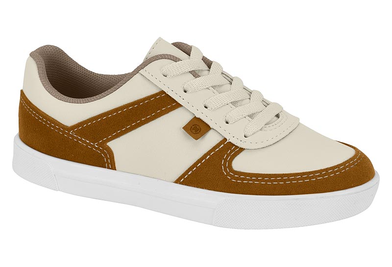 O tênis casual infantil em creme com detalhes caramelo oferece conforto e durabilidade para o dia a dia das crianças.