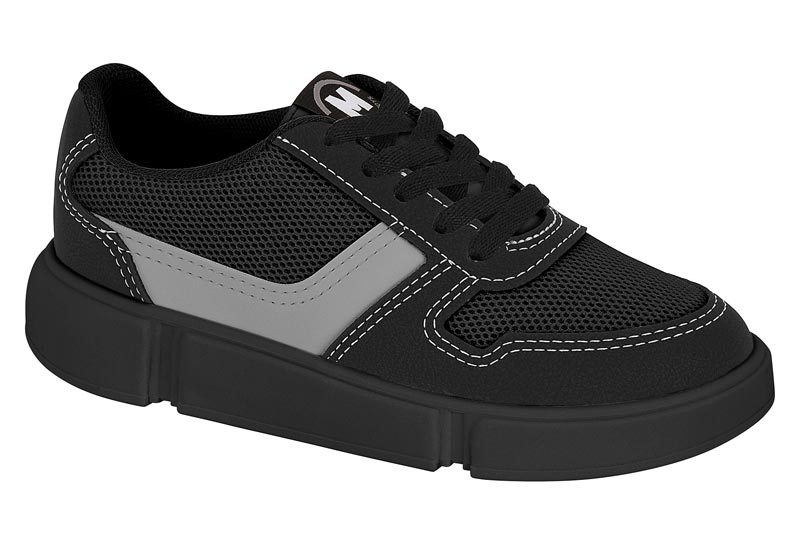 O tênis tem cabedal em tecido mesh preto com detalhes em cinza que facilitam a ventilação dos pés. O solado emborrachado é resistente e antiderrapante para evitar escorregões. O fechamento é por cadarço, permitindo ajuste personalizado. É uma opção prática e estilosa para crianças.
