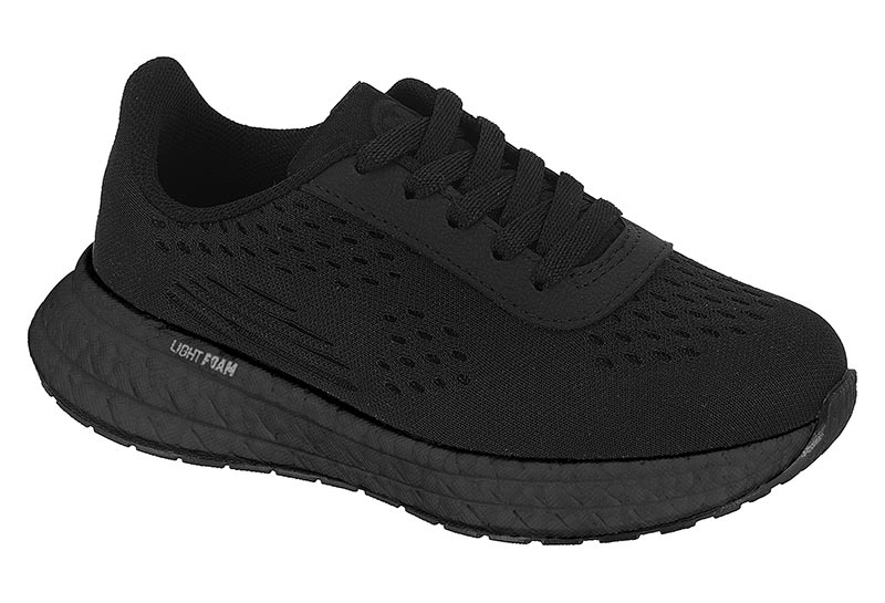 O tênis é fabricado em material têxtil com pontos de ventilação nas laterais, o solado de EVA preto proporciona leveza e maciez. Possui palmilha confortável e fechamento em cadarço para maior ajuste, garantindo segurança e estabilidade ao caminhar.